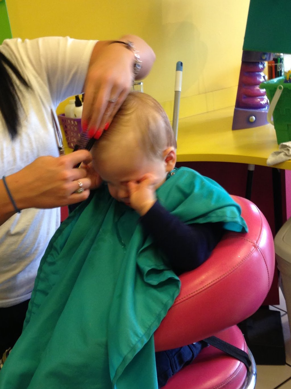 I had no idea what to expect. What I was hoping for was that he'd be a little shy and just sit still for the stylist. Kind of in a state of shock. I wasn't even sure a haircut would be possible. On Saturday we decided to go for it. We loaded him up and headed to Snip-its, a kid friendly haircut place. First, I was a little shocked it cost 16.99. Yep, I'm cheap. Although based on the kid friendliness of the place I get where the money goes and it is worth it. Plus, any unique service usually costs more. (then I thought about the cost of my own haircuts and got over it real quick!)